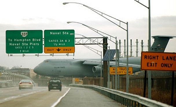 NORFOLK -- One of the military’s largest transports was stuck on a runway atop the I-564 overpass for more than 16 hours, unable to turn around at the West end of Chambers Field at the Norfolk Naval Station. The incident, starting about 1 a.m., forced the closing of the field for most of the day to all but helicopter traffic and made for a dramatic sight to hundreds of motorists passing beneath it during the morning rush hour. “That thing’s like a big building sitting there,” said some motorists. The aircraft’s nose was so far over the end of the ramp, the crew was unable to see the runway where it was supposed to turn around. The pilot stopped the aircraft and prevented it from running off the ramp.